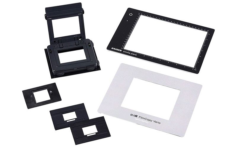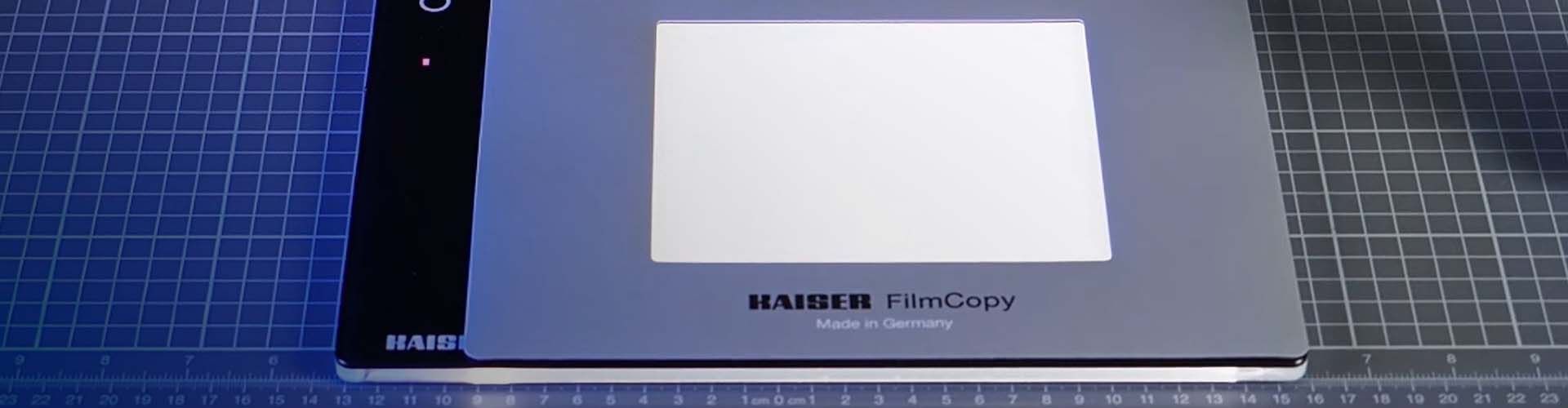Este kit incluye la mesa de luz LED Kaiser “slimlite plano” (KA2453) para la visualización y ordenación de diapositivas y negativos y para iluminación durante la digitalización de estos. El área de iluminación es de 22 x 16 cm, con una temperatura de color de luz día de 5000 Kelvin y un CRI = 95. La mesa de luz posee control de intensidad de la iluminación, y puede funcionar mediante batería o conectada a la corriente.