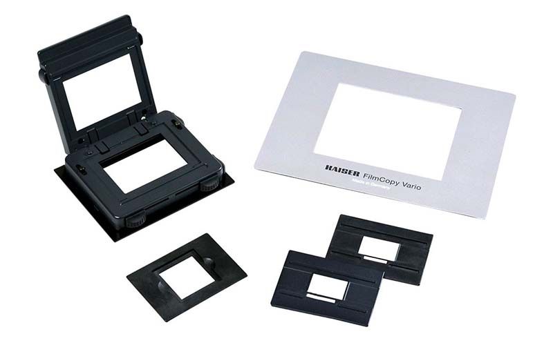 Incluye inserto para diapositivas montadas (5 x 5 cm) de 35 mm y máscara de formato para película de 35 mm con guías para tiras de película. Con las máscaras de formatos e insertos en vidrio opcionales, es también compatible para película de en formato 4.5 x 6 cm, 6 x 6 cm y 6 x 9 cm. Es muy fácil el cambio de inserto. Las diapositivas montadas de 35 mm se pueden colocar en el dispositivo directamente desde arriba, mientras que para la colocación de tiras de película se debe abrir el dispositivo.
