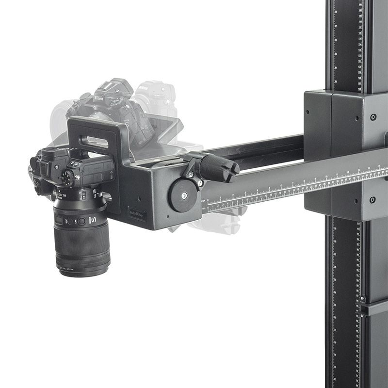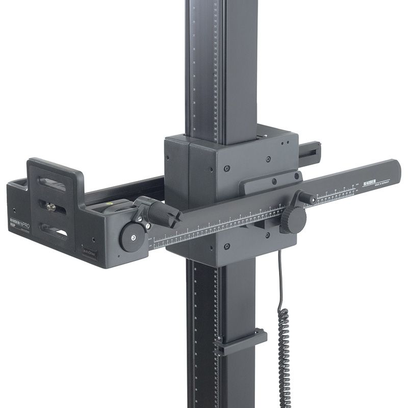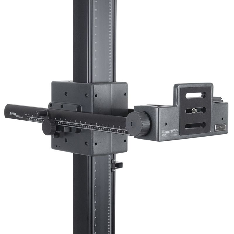 Sistema de soporte con base al suelo del sistema profesional de reproducción rePRO. Brazo de cámara equipado con ajuste de altura motorizado, con control mediante PC/portátil (Windows) o mediante control remoto por cable. Las posiciones de altura se pueden almacenar y recuperar con una precisión de repetición de aproximadamente 1/100 de milímetro. Incluye el programa de control “Kaiser autoDrive”.