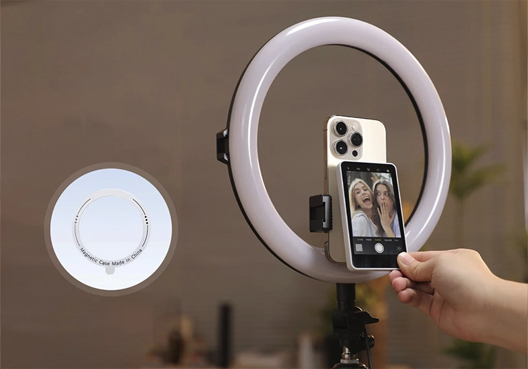 La versión más avanzada. Incorpora control por gestos con IA, duplicado de pantalla en 4K por cable y una luz LED externa de relleno, ideal para retratos, maquillaje, tutoriales y grabaciones con poca luz.